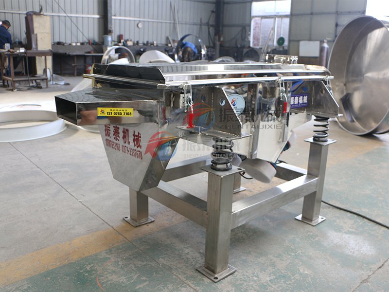 枸杞直线筛使用振动电机作为振动源,采用双振动电机驱动,当两台振动电机做同步、反缶旋转时,振动电机偏心块所产生的激振力在平行于振动电机轴线的方向相互抵消,在垂直于振动电机轴线的方向重叠为一合力,因此振动筛机的运行轨迹为一直线。两电机轴相对筛面有一倾角,在激振力和物料自重力的合力下,物料在筛面上被抛起跳跃式向前做直线运动,通过各不同层次筛网筛分多种规格的筛上物、筛下物,又从不同的出料口排出,流入料仓或盛料筒,从而达到对物料进行筛分的目的。